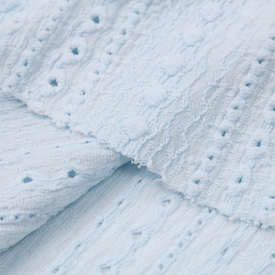 Simer Textile is an exporting factory and manufacturing supplier of soft light blue eyelet stretch poly crinkle knit fabric for casual fashion dress and skirts in Shaoxing China.
